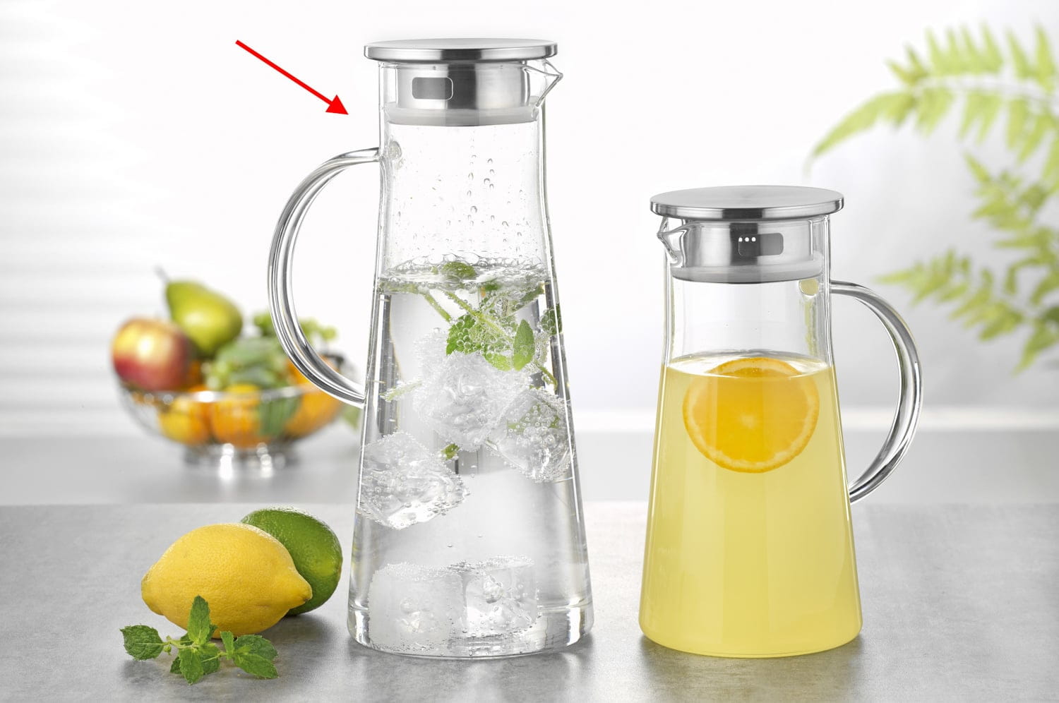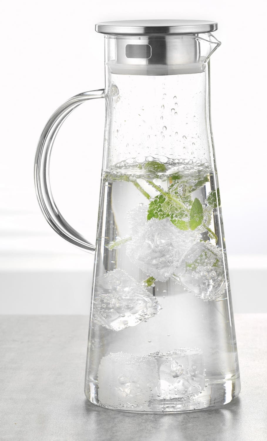 Glaskaraffe FARO, mit Griff, Inhalt: 1,7 Liter Höhe: 285mm, Durchmesser: 117 mm, Deckel aus Edelstahl 18/10 mit Silikondichtung.Glaskaraffe mit Griff. Aus Borosilikatglas für Besahl 18/10, mit Silikon. Inhalt: 1,7 Liter. Höhe 28,5cm.
