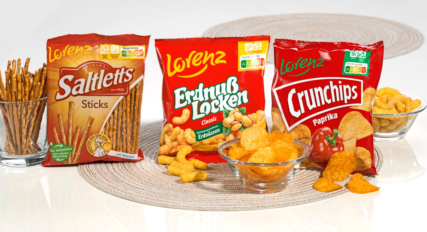 Die Lorenz Erdnuss Locken von LORENZ sind ein bewährter Knabbersnack für Hotellerie, Gastronomie, Catering und Gemeinschaftsverpflegung. Die lockige Form sorgt für eine gute Portionierbarkeit in Snackschalen, am Barbereich oder als Begleiter zu Getränken. Die Rezeptur auf Basis von Maisgrieß mit 33% Erdnusskernen, Pflanzenöl und Salz wird durch Tomatenpulver, natürliches Aroma sowie den Geschmacksverstärker Mononatriumglutamat abgerundet. Allergenhinweis: enthält Erdnüsse; kann auch Gluten und Milch enthalten.
