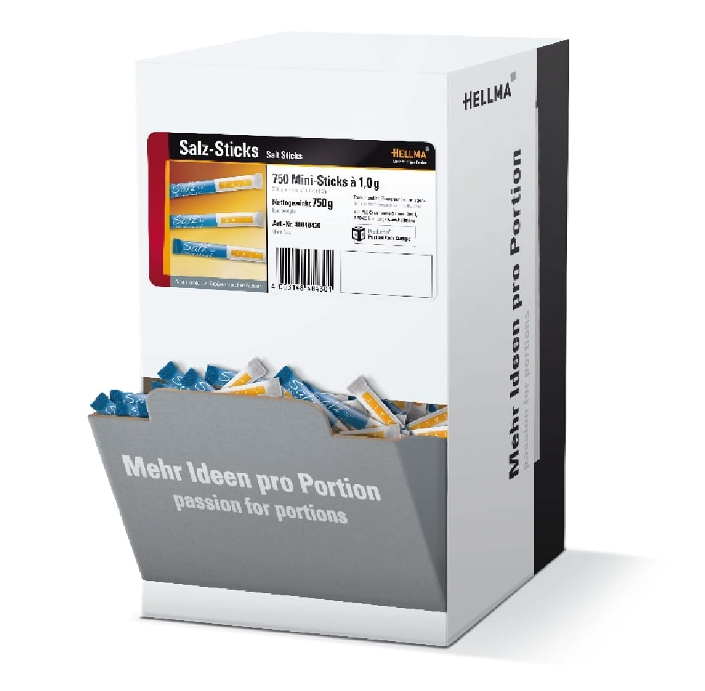 Das Salz in hygienischer Portionspackung von HELLMA ist die praktische Lösung für alle Bereiche, in denen Sauberkeit, Kalkulationssicherheit und schnelle Ausgabe zählen: Frühstücksbuffet, Konferenzservice, Take-away, Catering und Gemeinschaftsverpflegung. Jeder Stick enthält ca. 1 g Speisesalz – ideal für eine standardisierte Dosierung am Tisch oder am Ausgabepunkt. Die sehr lange Haltbarkeit unterstützt wirtschaftliche Bevorratung, reduziert Verderbsrisiken und erleichtert die Lagerplanung.