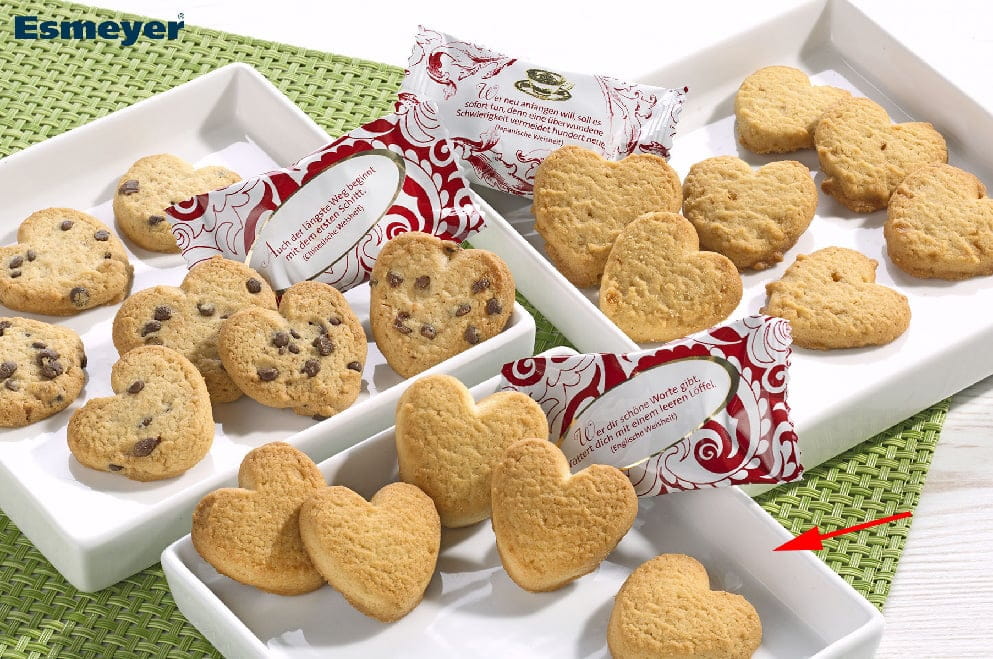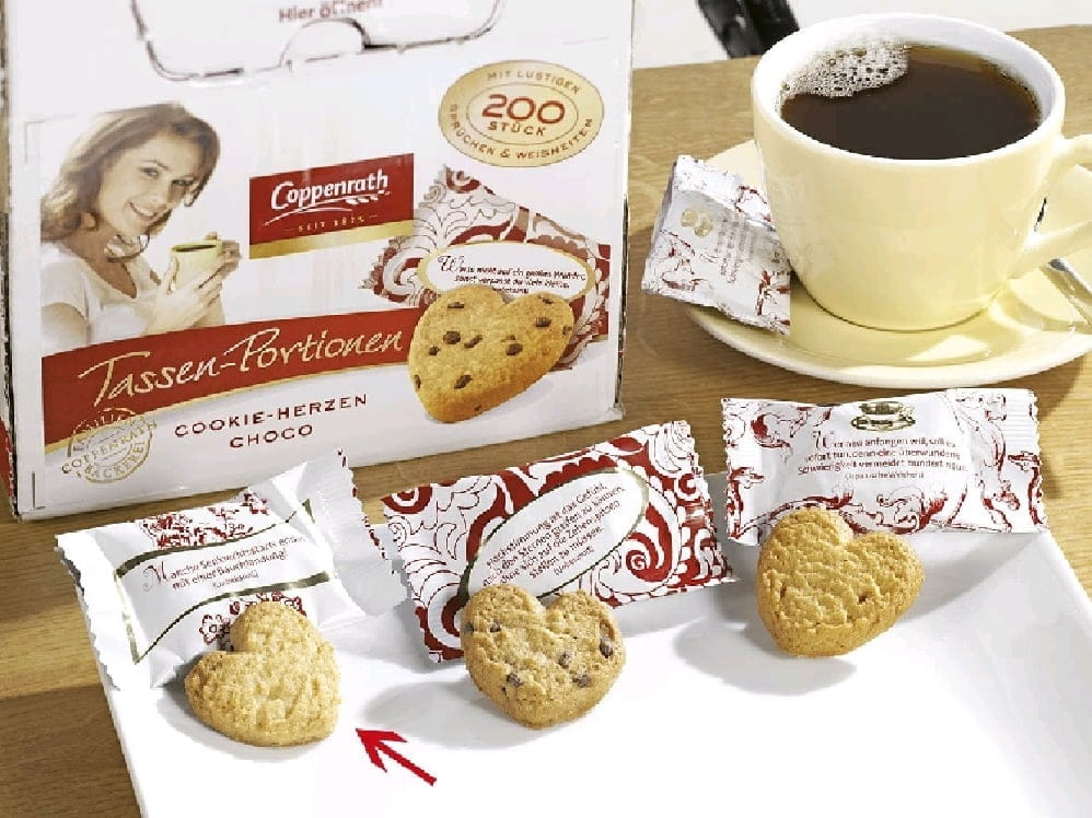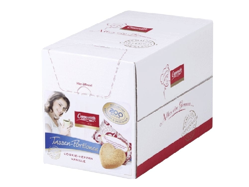 Die Coppenrath Cookie-Herzen Vanille von COPPENRATH sind feines, portionsgerechtes Gebäck für Hotellerie, Gastronomie, Catering und Gemeinschaftsverpflegung. Mit 5 g pro Stück eignen sie sich ideal als Beigabe zu Kaffee- und Teeservice, am Konferenzbuffet oder als kleines Extra zur Dessertkomponente. Die Herzform unterstützt eine hochwertige, einheitliche Präsentation bei planbarer Kalkulation und schneller Ausgabe. Rezepturbasis: Weizenmehl, Zucker, pflanzliches Fett (aus Palmfrucht), Butter, Vollei, Glukose-Fruktose-Sirup, Salz, Zitronenraspel, Bourbon-Vanille, Vanillearoma; Backtriebmittel: Ammoniumhydrogencarbonat, Natriumhydrogencarbonat.