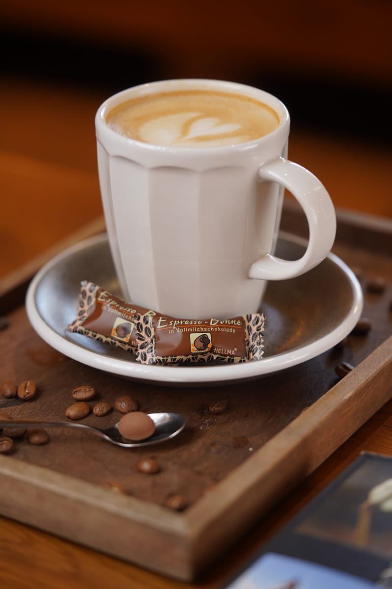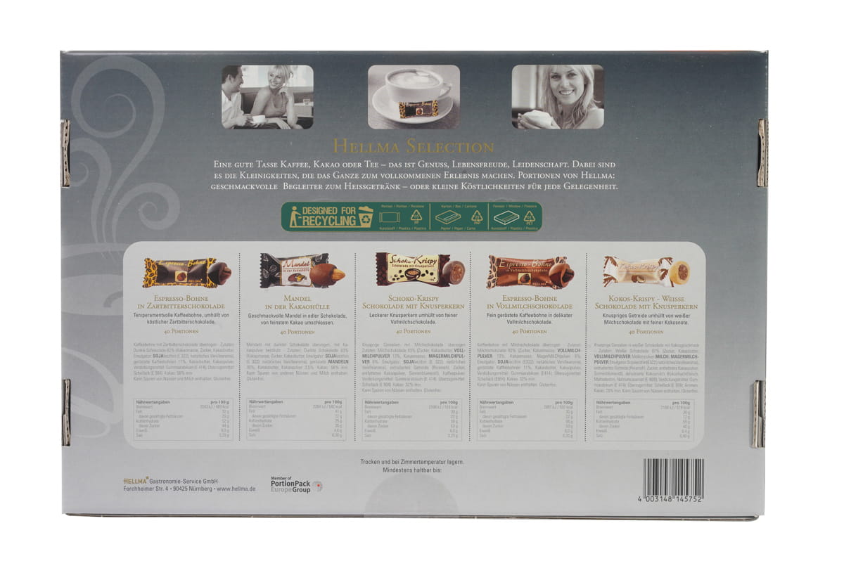 Die Hellma SELECTION-BOX von HELLMA ist die kompakte Lösung für Empfang, Tagung, Bar, Zimmer, Konferenz- und Kaffeestation. Sie bietet fünf fein abgestimmte Sorten: Espresso-Bohne in Zartbitterschokolade, Mandel in dunkler Schokolade, knusprige Cerealien in Milchschokolade, Kaffeebohne in Vollmilchschokolade sowie Waldbeerengelee in Milchschokolade. Ideal, wenn Sie Gästen und Mitarbeitenden eine hochwertige Aufmerksamkeit mit klaren Produktinformationen bereitstellen möchten.