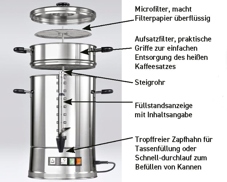 - Edelstahl-Aufsatzfilter mit herausnehmbarer Micro-Feinfilterscheibe – kein Filterpapier