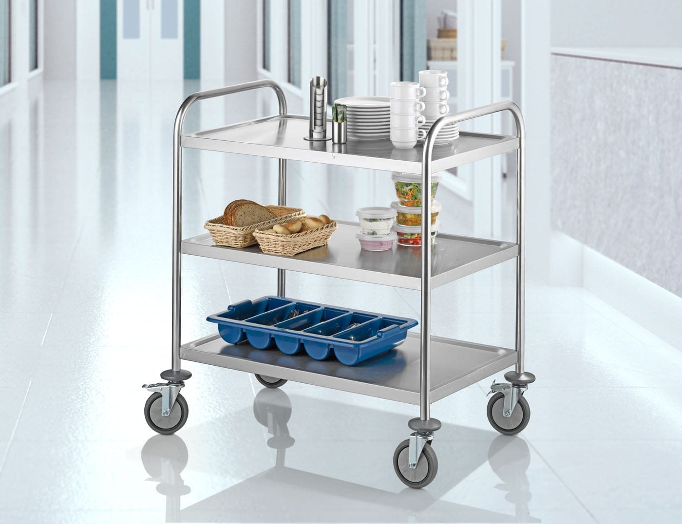 Jede Ebene ist für bis zu 40 kg ausgelegt – ideal für Tabletts, GN-Behälter oder Serviergeschirr im täglichen Betrieb. Das Material 18/0 steht für robuste Alltagstauglichkeit in der Großküche. Als Lösung im Contacto-Sortiment eignet sich der Servierwagen besonders für Betriebe, die Wert auf belastbare Standards, nachvollziehbare Beschaffung und reibungslose Prozesse legen.