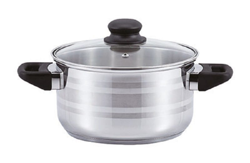 poliert mit seidenmatten Streifen, schwarzer Kunststoffgriff, Farbeinleger, für alle Herdarten geeignet, auch Induktion