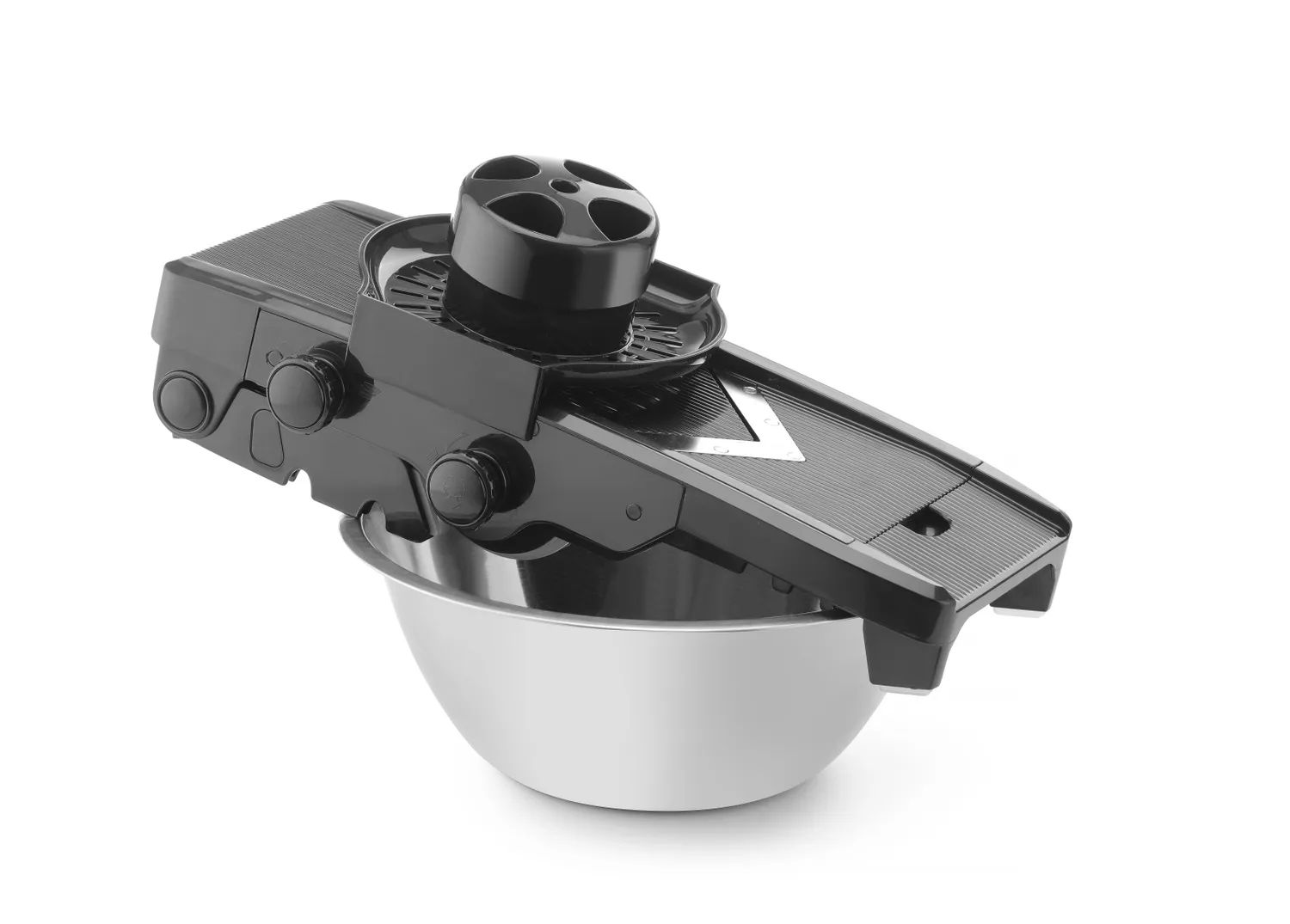 - 5 qualitativ hochwertige Messereinsätze ausEdelstahl- Antirutschfuß klappbar- Messereinsätze in V-Form für effektives Schneiden:- Pommesmesser, - Scheibenstärke manuell einstellbar von 1-9 mm- Julienne-stärke manuell einstellbar von 6-9 mm- Schneidguthalter mit MetallstiftenHöhe 140 mm mit ausgeklapptem Fuß
