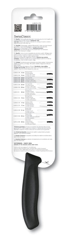 Der ergonomische Griff aus thermoplastischer Elastomere bietet sicheren Halt, auch bei längeren Arbeitsphasen. Leichtes Design und ausgezeichnete Balance unterstützen präzises Arbeiten und verringern Ermüdung. Das Messer ist spülmaschinengeeignet und auf Langlebigkeit ausgelegt – für dauerhafte Verlässlichkeit im Küchenprozess. Verpackt im Blister, made in Switzerland von Victorinox.