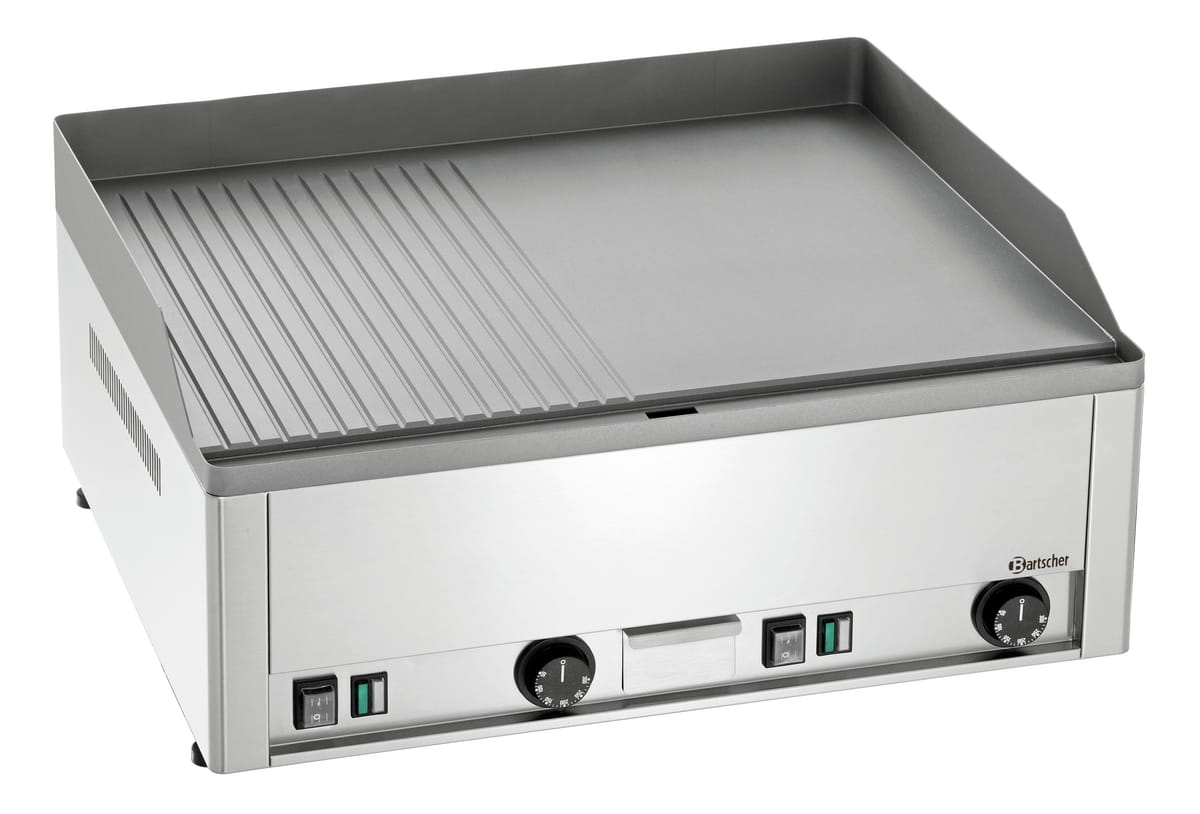 Die Elektro-Griddleplatte glatt / gerillt 2 Zonen Tischgerät 400V ist für den durchgängigen Einsatz in Hotellerie, Gastronomie, Catering und Gemeinschaftsverpflegung ausgelegt. Als Tischgerät (Typ: GDP650E-GR) bietet sie auf 650 x 480 mm eine robuste Stahlplatte, zur Hälfte gerillt und zur Hälfte glatt – ideal, um Steaks mit Branding und zugleich Gemüse, Eier oder Pancakes auf einer Fläche zu produzieren. Zwei separat regelbare Heizzonen unterstützen präzises Timing bei wechselnden Auslastungen. Der Temperaturbereich von +50 bis +300°C ermöglicht schonendes Warmhalten bis scharfes Anbraten. Eine Kontrollleuchte signalisiert den Betriebszustand, der Fettauffangbehälter erleichtert hygienische Abläufe. Das Gehäuse aus CNS 18/10 ist langlebig und pflegeleicht. Passend für Küchen, die auch Bartscher-Standards erwarten.
